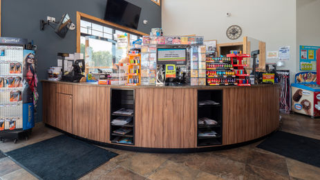 The vaulted ceiling and abundant windows give this convenience store a bright, modern feel.